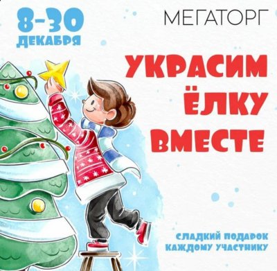 Уважаемые родители! Хотите поучаствовать в создании новогодней атмосферы? С 8 по 30 декабря в ТК Мегаторг будет проходить мероприятие «Украсим елку вместе», в котором вы можете принять участие и помочь в украшении ТК к Новому году!